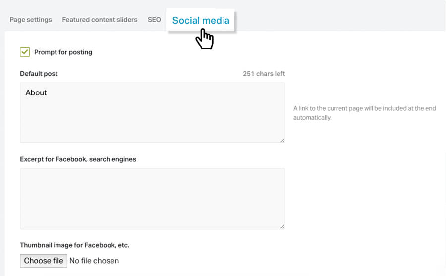 The Sharing or Thumbnail images can be uploaded under Settings > Social Media for every page, subpage, post or event. In some cases, this image will appear as the thumbnail, for example, in Blog or Calendar pages; the Blog Post or Event pages need thumbnail images to show in the Blog and Calendar, respectively, and in the sections showing Latest News or Events.